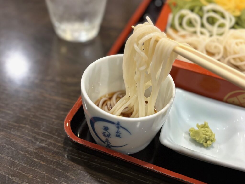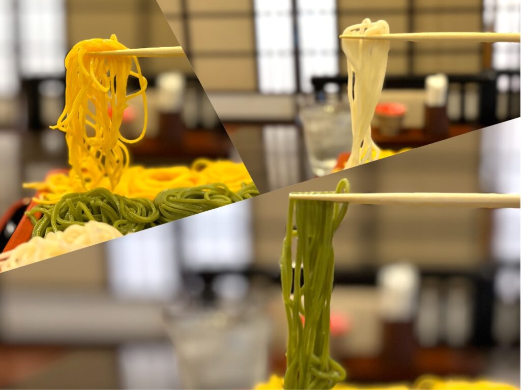 緑が茶そば。茶そばの香りがフワリと広がり、更科との香りの違いが面白い。