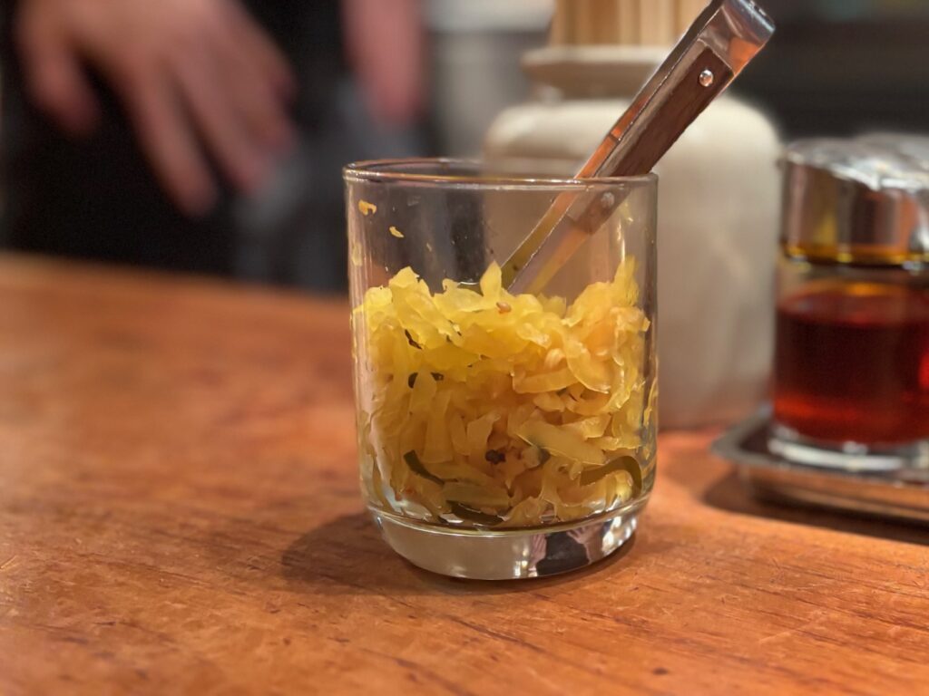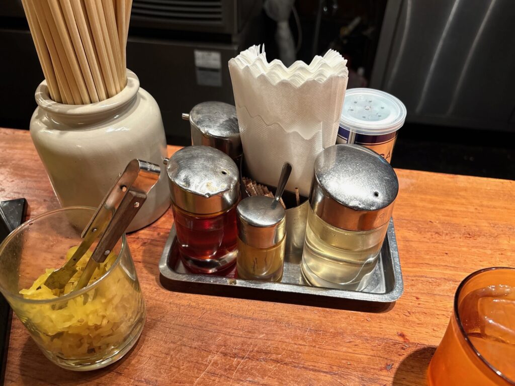 酢やラー油、醤油、胡椒があり、これは餃子とか用だとは思うが、沢庵の刻んだやつが置いてある。