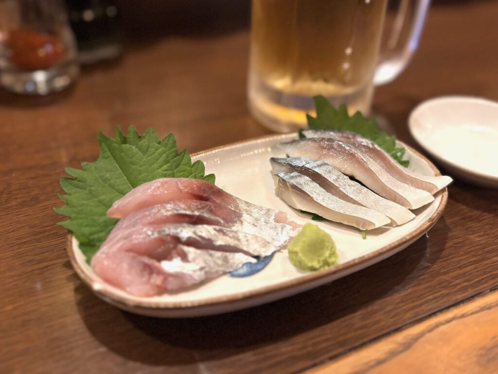 アジはちょっと骨があったりしたけど、〆鯖は強めのシメ具合で生ホッピーと合うね。