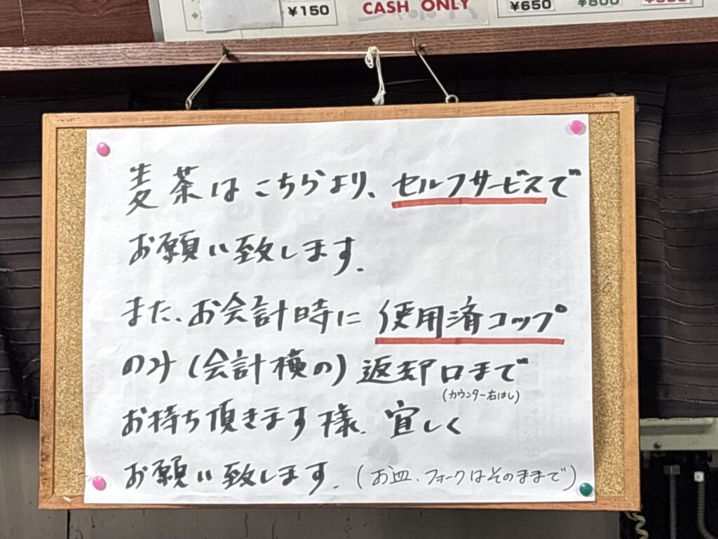 誘導されるがまま並ぶ→順番がまわってきたら指定された席へ→中央にある麦茶のコップを持って着席、注文→食べ終わったら皿はそのまま、麦茶のコップをお会計のところまでもっていきお会計。