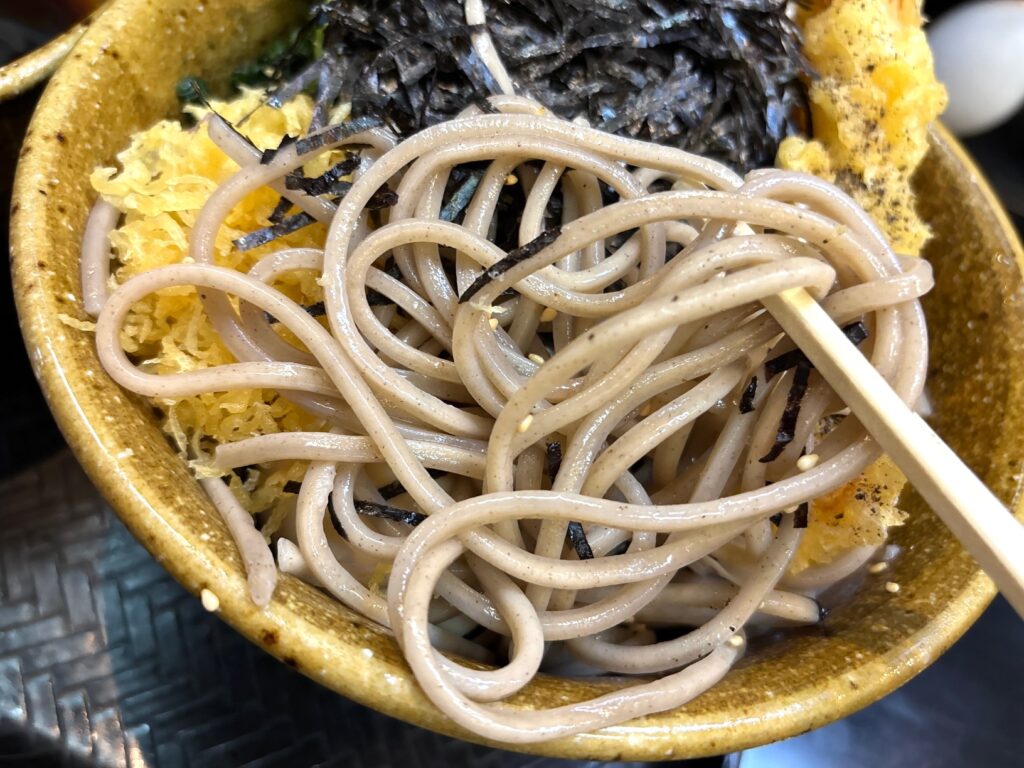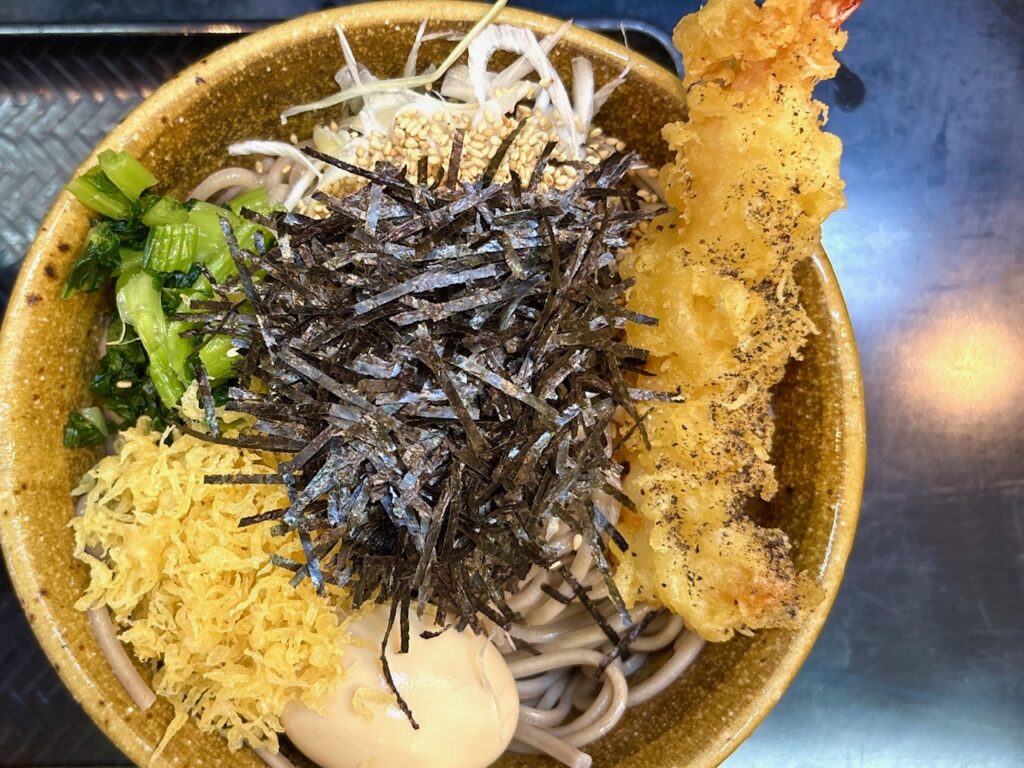 蕎麦と海老天以外だと、野沢菜?刻み海苔、天かす、すりごま、刻み葱がドカッと乗っている!ボリュームがすごい!