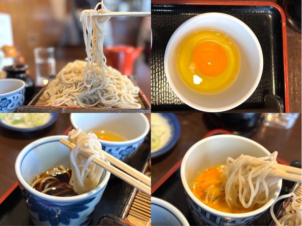 生卵蕎麦ってあまりやらないんだけど、生卵も絡めても美味しいよ。