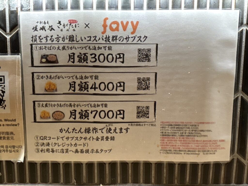 - 月額700円…蕎麦の大盛りと、かき揚げ追加がいつでも可能