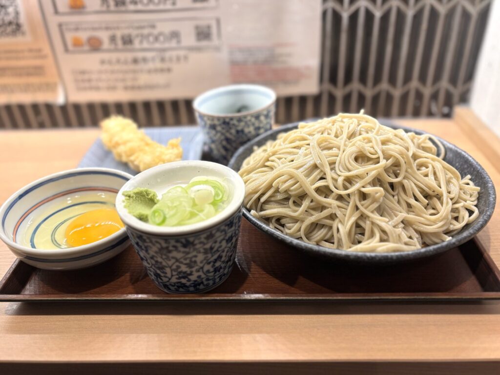 ぶるちゃんは500gあるもり蕎麦『特もりそば(800円)』と『えび天(300円)』、『生卵(70円)』をチョイス!