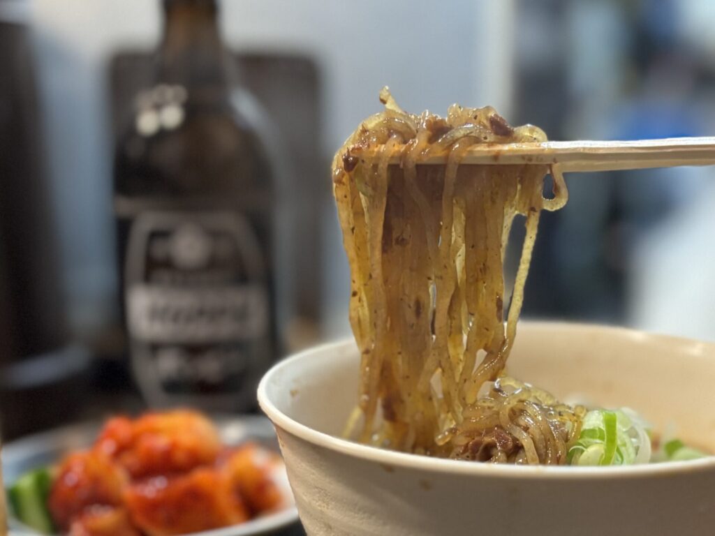 煮込みの煮汁で食べるしらたきって感じで、ラーメンの麺リフトみたいに撮ったので見てくれよ!