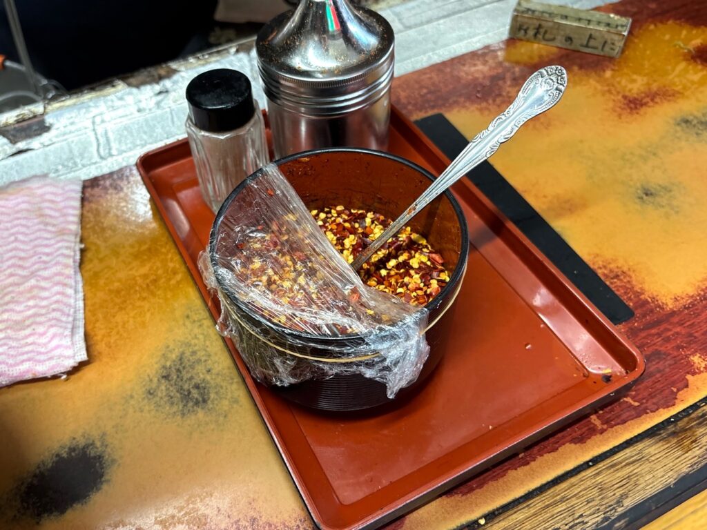卓上調味料もある。この唐辛子美味しかったな。