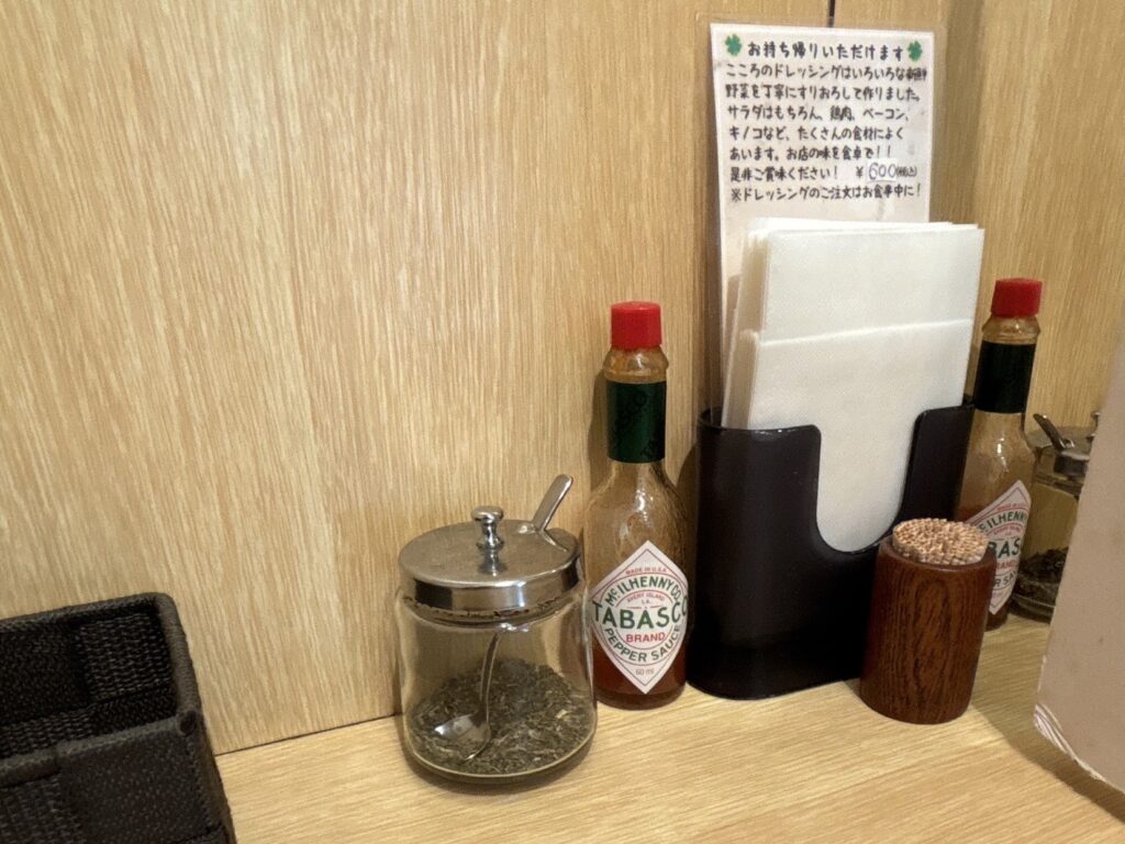 卓上にあるハーブっぽい調味料&タバスコを使う。